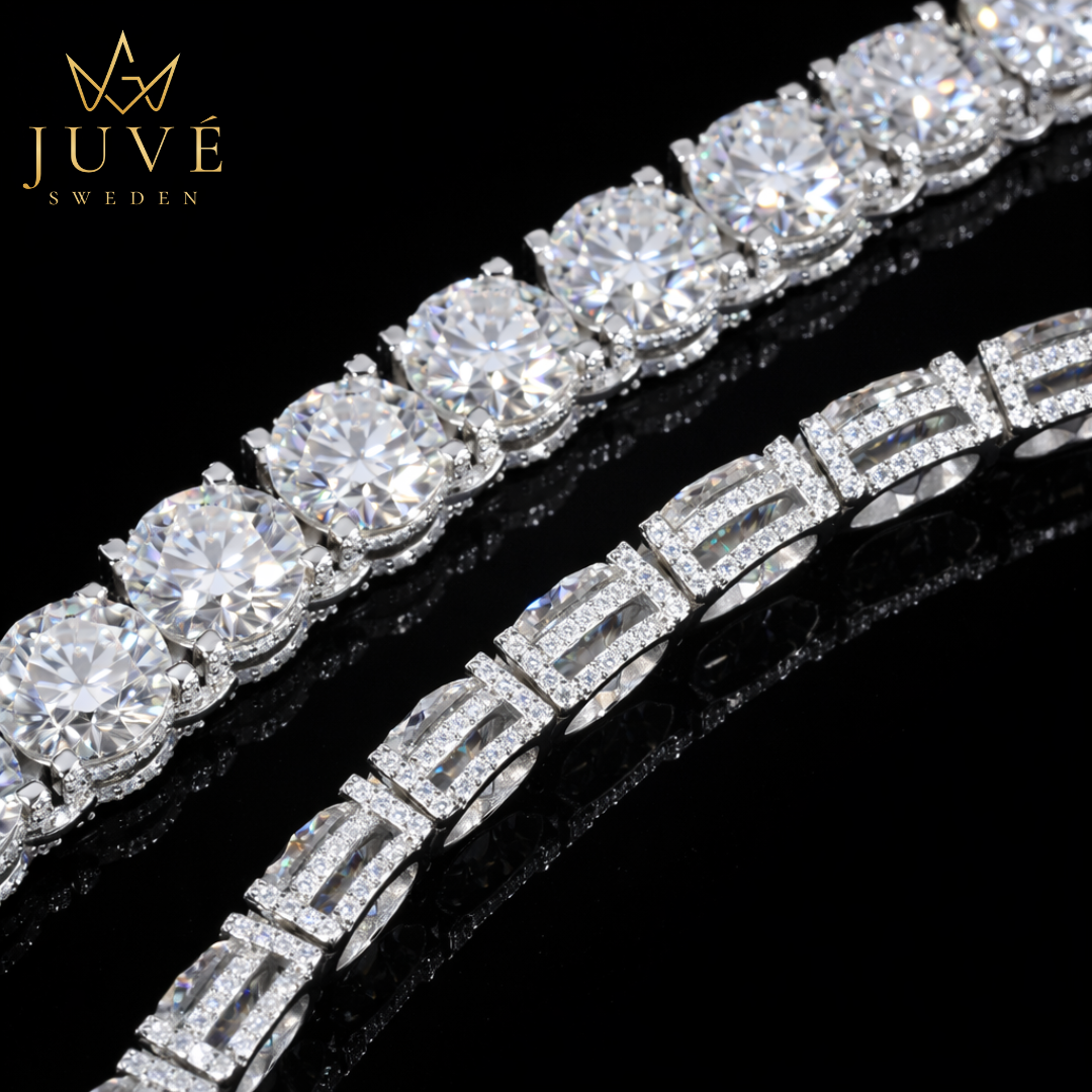 This piece is set with D Color, VVS1 clarity moissanite stones, selected for their exceptional fire, brilliance, and optical purity. Renowned for reflecting more fire than traditional diamonds, moissanite delivers an intense, luminous presence even in low light.