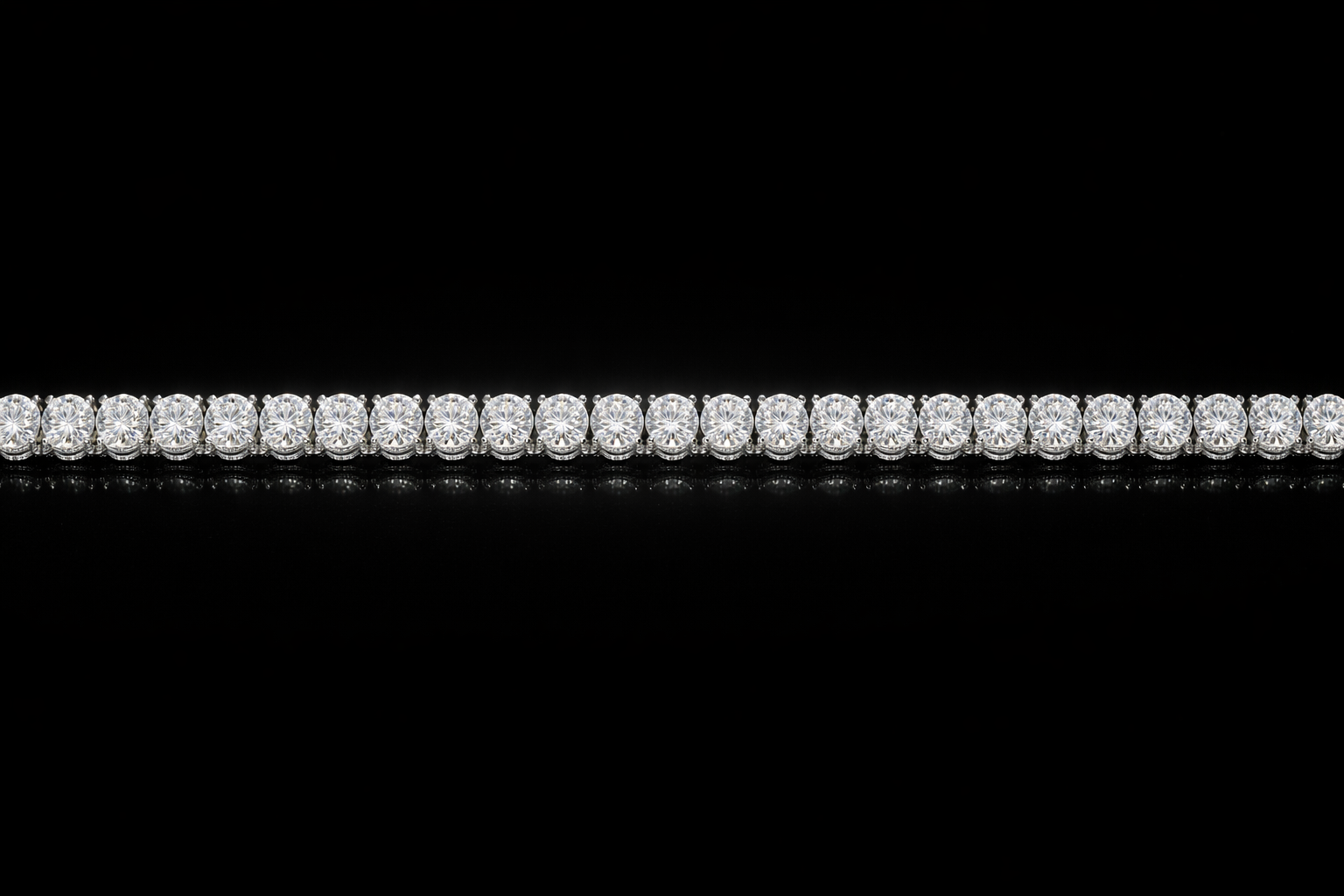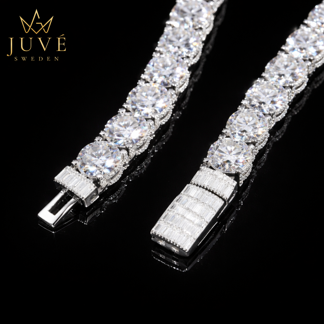 Unlike standard tennis necklaces that emphasize only the main stones, this piece is fully pavé-set throughout. Every link is framed by precisely placed accent stones, creating a continuous surface of light.